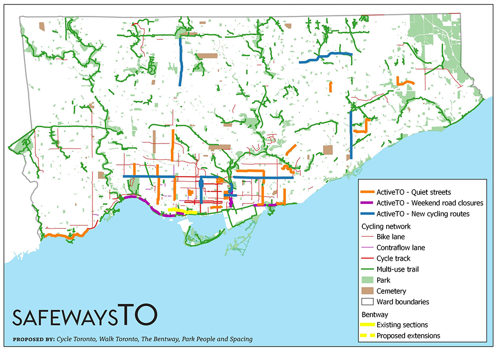 To demonstrate the emerging potential of this network Cycle Toronto, Walk Toronto, The Bentway, Park People and Spacing have come together to compile and release an intuitive and accessible SafewaysTO map that is accessible at https://tinyurl.com/ydcayec2. You can also view a static map (as of June 4, 2020).