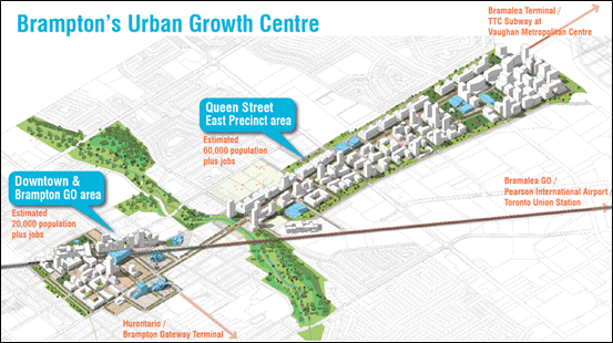 Brampton’s urban growth center covers 224 hectares (553 acres) and serves a population of 80,000. Plans were identified through Brampton City Council’s endorsement of the Brampton 2040 Vision in 2018, and Queen Street Precinct Plan in 2020. Downtown Brampton will be enabled by all-day two-way commuter rail, bus rapid transit, commitments from the province of Ontario for new light rail, and an airport-link service. The Queen Street Corridor is planned to attract significant growth through revitalization and infill/intensification that will continue the transformation of the area into a transit- and pedestrian-oriented district of walkable neighborhoods. The plans for this urban growth center are being implemented through a combination of precinct plans to set a clear urban vision, and a development permit system to streamline approvals.