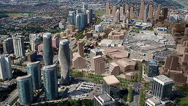 The city of Mississauga’s Downtown Core Local Area Plan approved the creation of a new downtown through repurposing lands around a shopping mall covering an area of 50.5 acres (20.4 ha). Mississauga City Centre will be served by light-rail transit and BRT. The city of Mississauga aims to achieve a gross density of 300 to 400 residents per hectare with a 1:1 population to employment ratio across the downtown area by 2031.